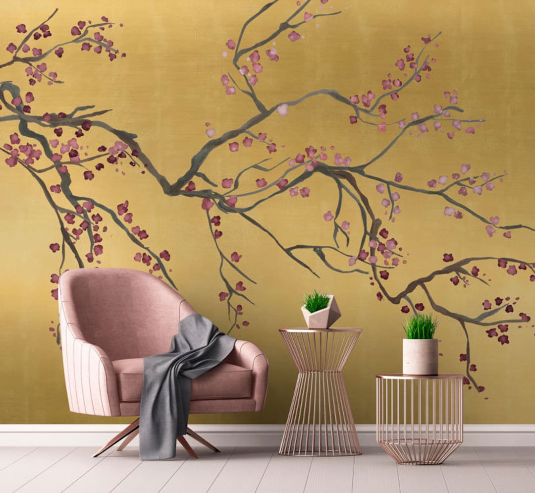Chinoiserie Gold Metallic Kirschbluten Tapete Luxus Tapete Etsy Schweiz